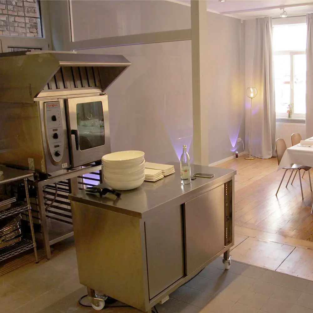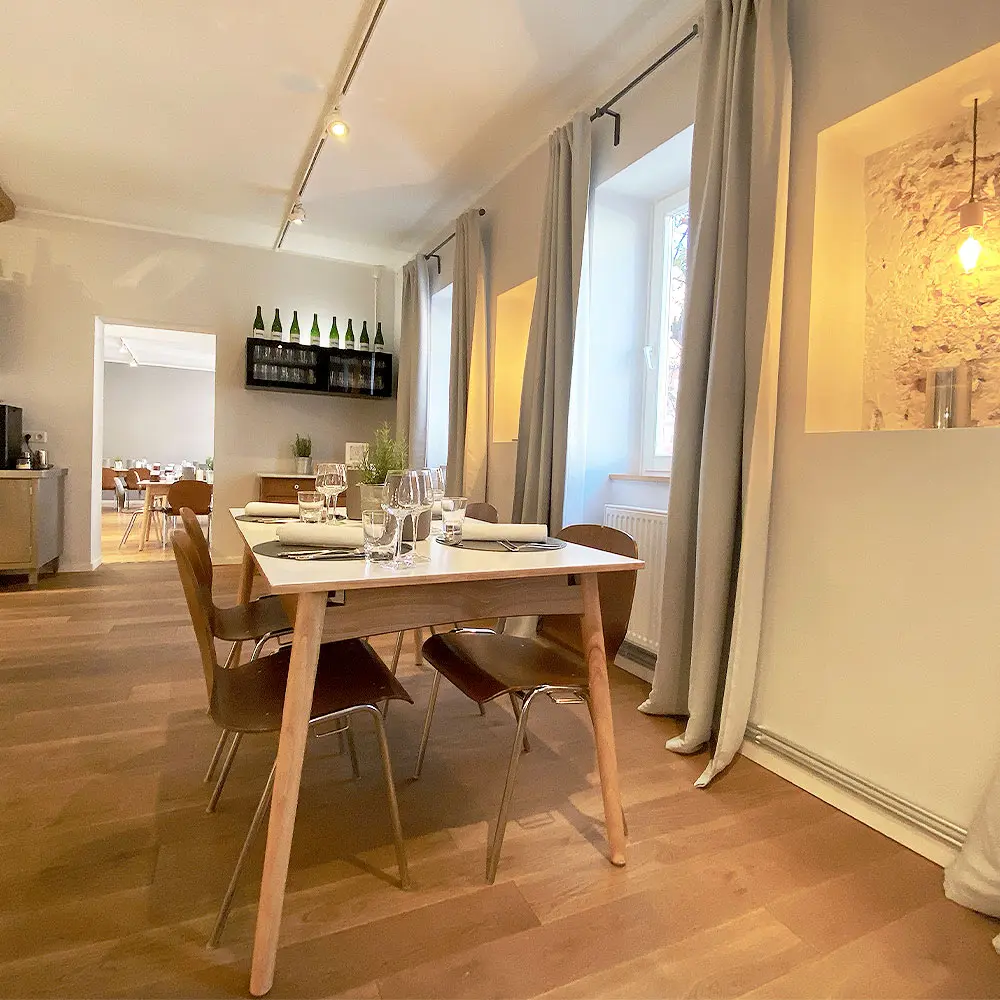 Ein besonderes Highlight ist die offen gestaltete Profiküche, die sich harmonisch in den gemütlichen Speiseraum einfügt. Ein zweiter Raum dient meist als Empfangsbereich und als kleine Ausruh-Oase. Die Einrichtung ist schlicht, aber einladend und heimelig. So entsteht schon beim Eintreten direkt ein gutes Gefühl.